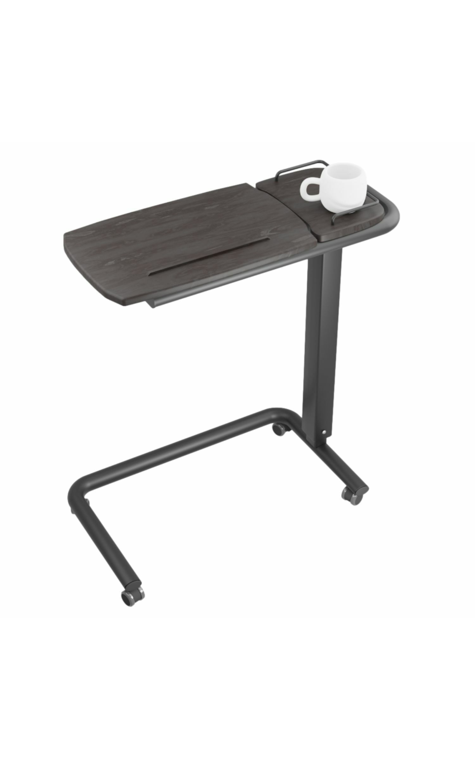 The split top tilts and locks in five positions for user comfort, while the smaller surface stays horizontal for drinks or items. The wide base fits most lift recliners and chairs, and the tilting top can be placed on either side of the fixed surface as needed.