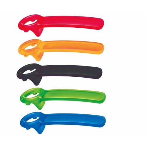 This 6-in-1 Multi Opener has a durable, comfortable grip and easily opens safety seals, bottle caps, ring pulls, jar lids, and bags with its built-in blade. Weight: 99 g.