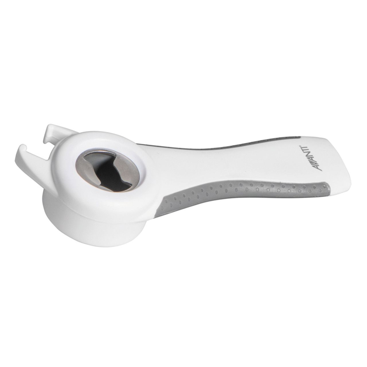 Opens cans of all shapes and sizes with a stainless steel blade. Has a intergrated magnet that ensures lids are securely held in place. Also has a bottle opener and a knife sharpener.